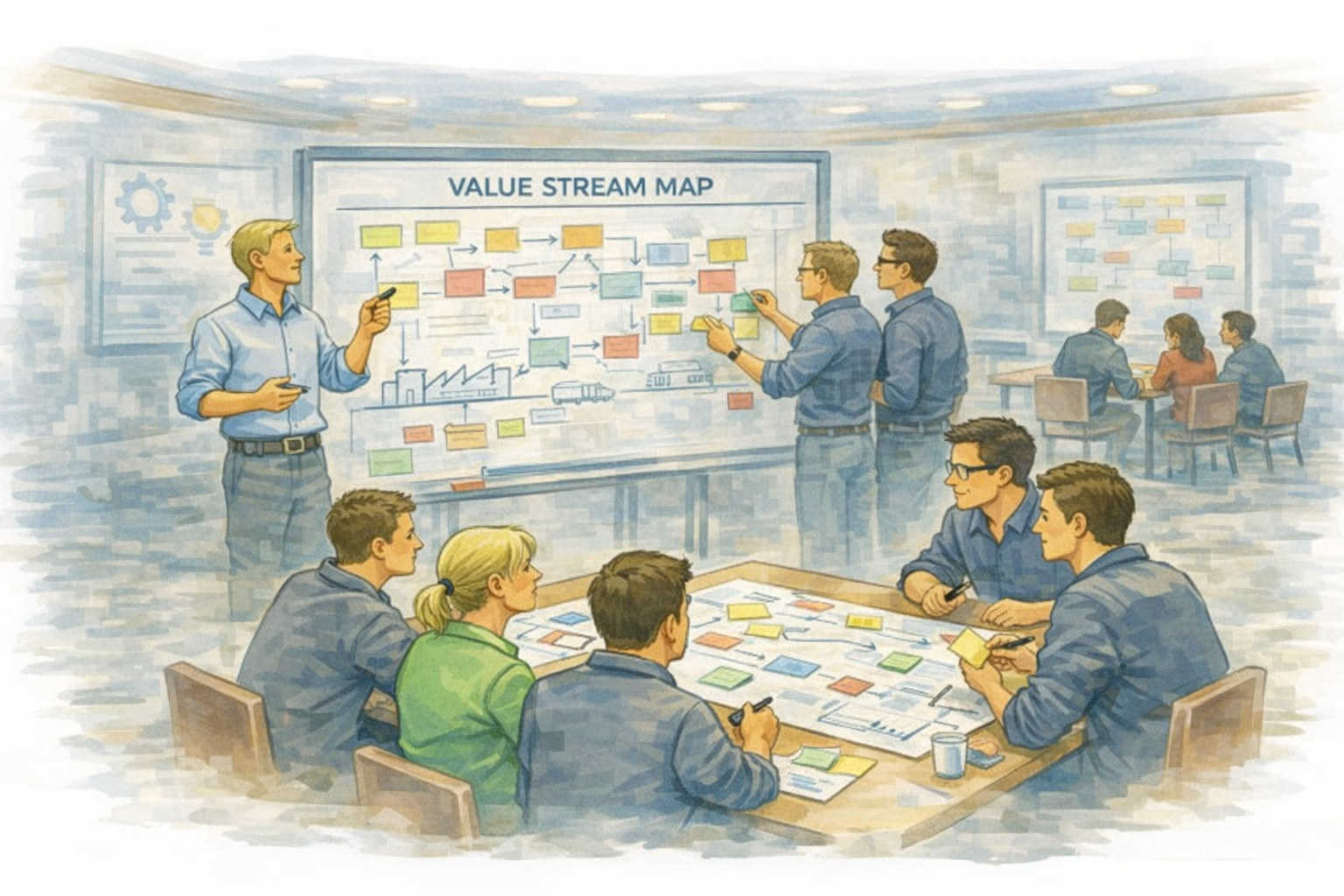 Der Klassiker um Prozesse darzustellen und zu analysieren. Ziel des Workshops ist den ganzheitlichen Wertstrom eigener Produkte, Dienstleistungen und Informationen darzustellen und daraus leistungsfähige Soll-Wertströme zu entwickeln. Gemeinsam mit Schlüsselpersonen aus Unternehmen werden Herausforderungen analysiert und Potentiale erarbeitet, um Verschwendungen aus der Durchlaufzeit zu eliminieren.